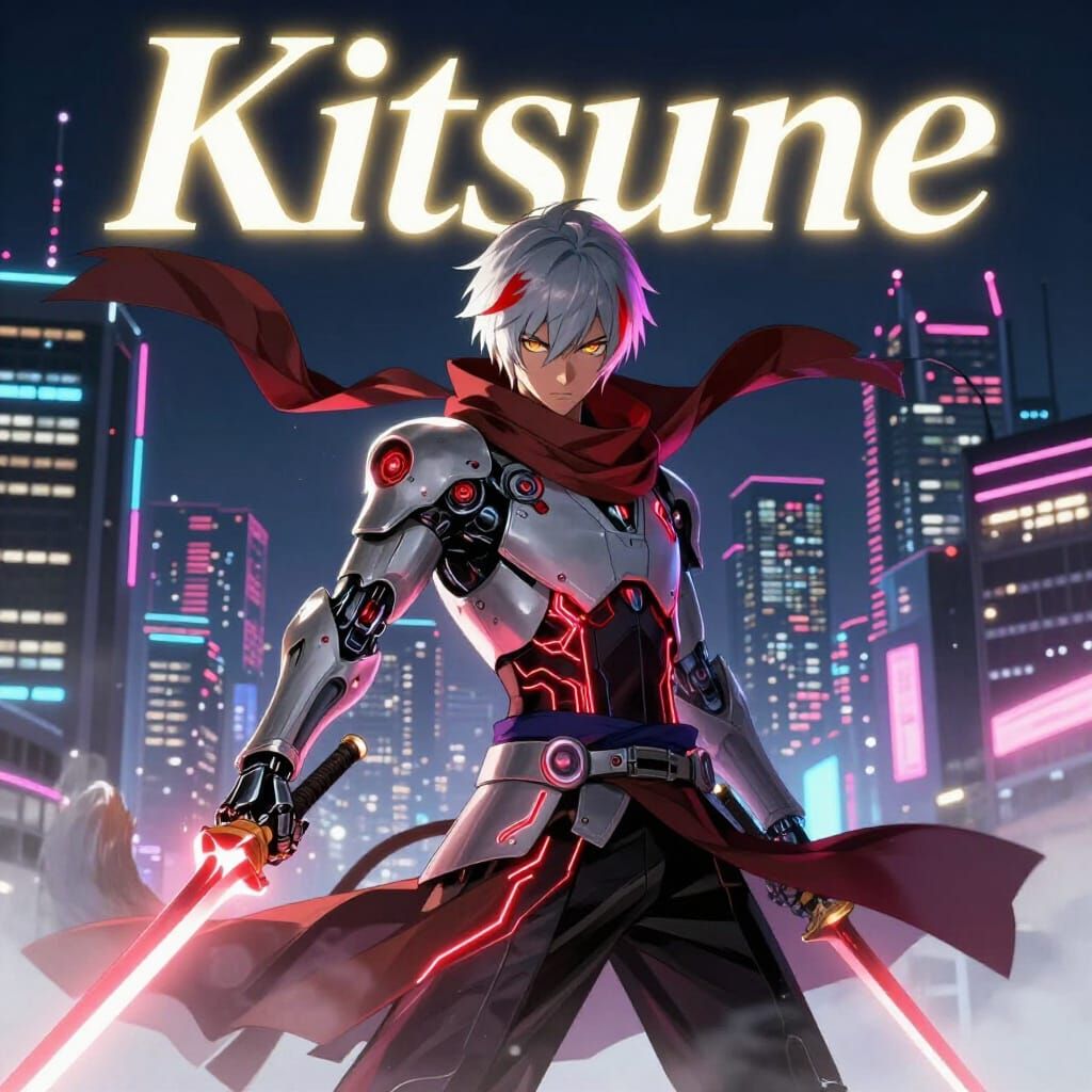 This comic book cover features Ryo Kitsune, a cybernetically enhanced warrior, poised against a vibrant neon Tokyo skyline. The art blends samurai and futuristic styles with detailed circuits and glowing energy daggers.