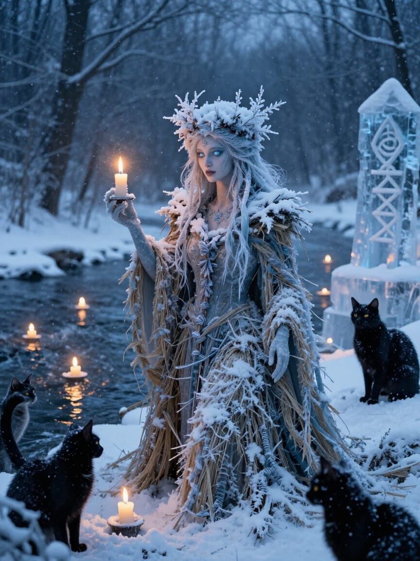 This image depicts a reimagined Slavic winter goddess, Marzanna, as a dark Christmas spirit. Crafted from frost, straw, and snow, she possesses an ethereal beauty. The scene blends ancient ritual with Christmas magic, featuring icy luminescence and warm candlelight.