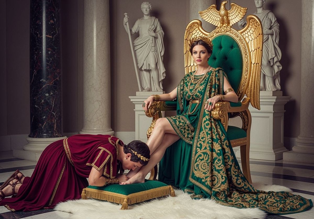 This image shows a Roman Empress on a gold and emerald throne. Dressed in green and gold, she sits barefoot as senators pay homage in a luxury palace with marble columns, captured in a professional photography style.