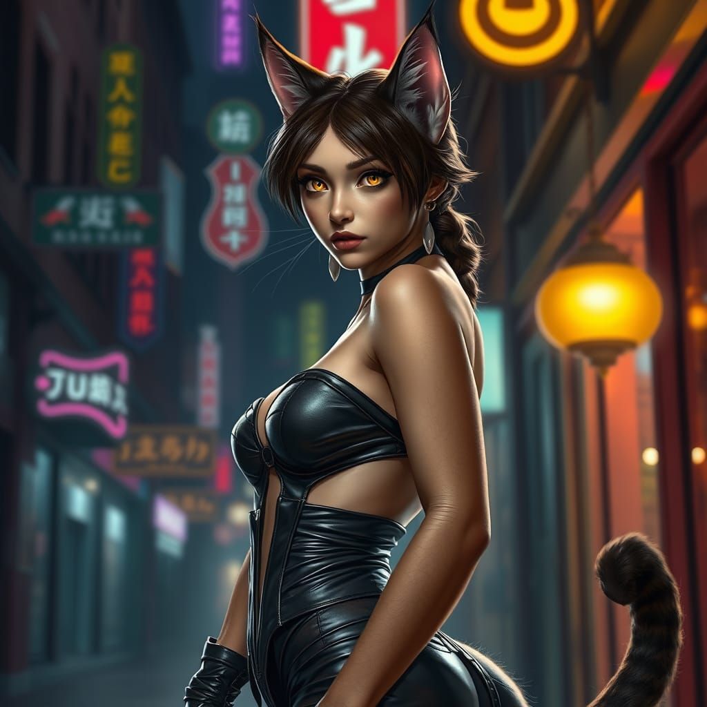 This captivating image combines human and feline features in a stunning, photorealistic portrait of a woman, set against a backdrop of urban nightlife with neon lights and dramatic shadows. Her sleek, glowing eyes and wild expression evoke a sense of sensuality and strength.