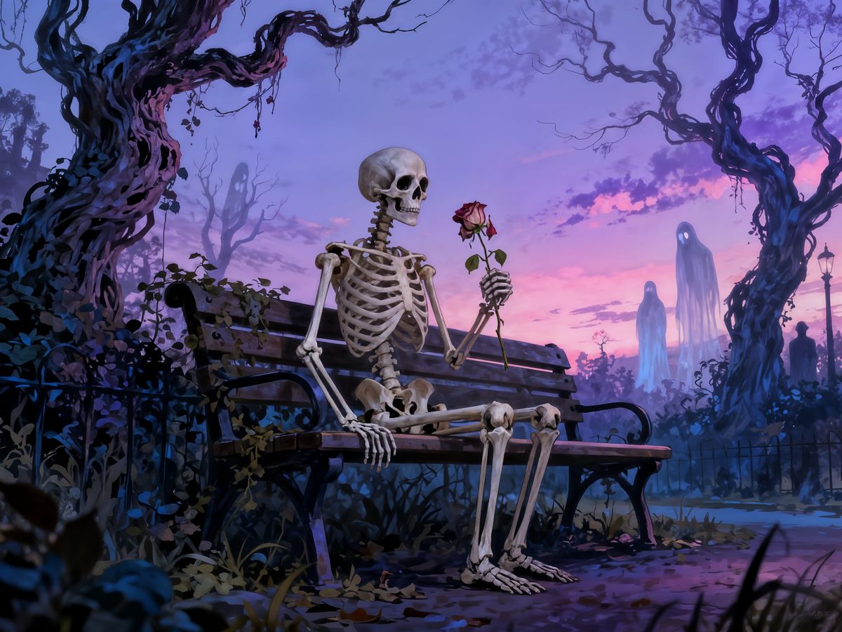 This image shows a lone skeleton sitting on a park bench with a wilting rose under a twilight sky. The park is overgrown and eerie, rendered with a painterly quality and atmospheric lighting.