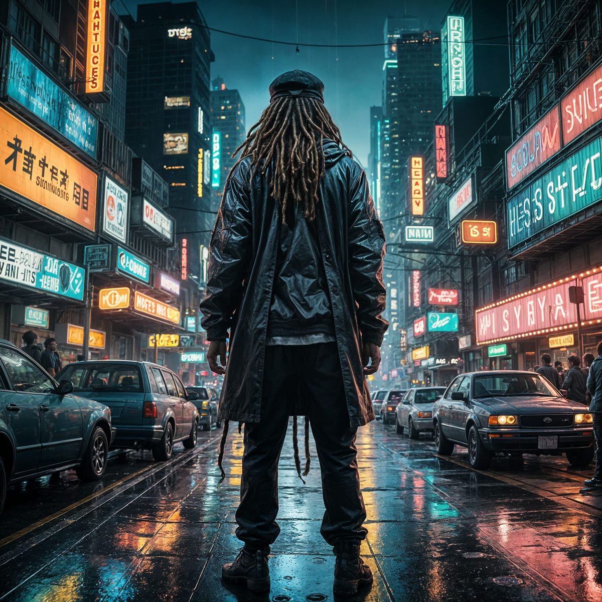 A striking picture of a Black man with dreadlocks performing on a stage in a desolate, futuristic city. The scene is lit with neon lights and reflects a retro aesthetic.