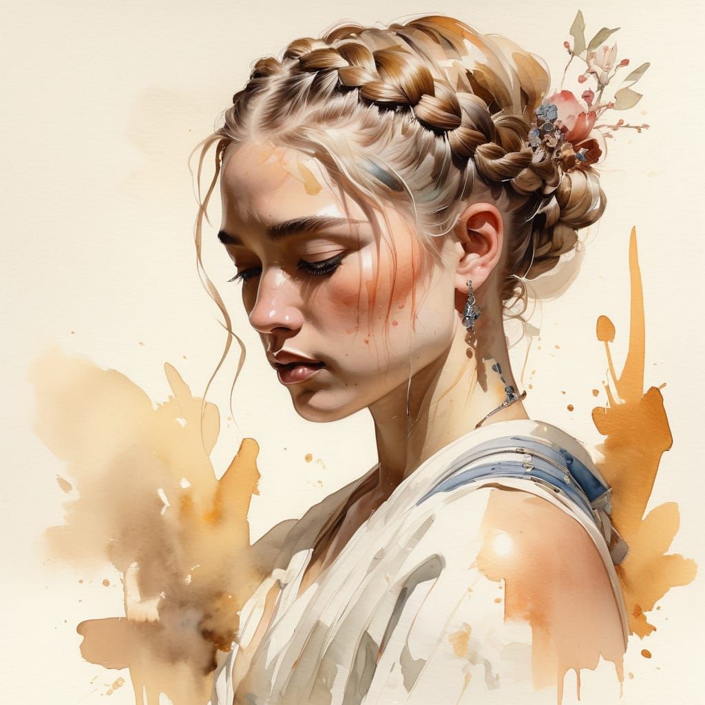 This watercolor painting features a confident female athlete with braided blonde hair, adorned in a white Roman toga and intricate Japanese color tattoos, set against a soft, vintage-inspired background with delicate linework and expressive brushstrokes.
