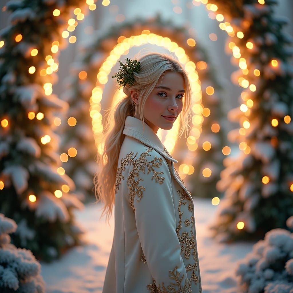 A magical Christmas scene of a smiling blonde woman in a white coat. Lush evergreens, glowing wreaths and fairy lights surround her in this fantasy concept art. The 8K image has a rich, vibrant color palette.