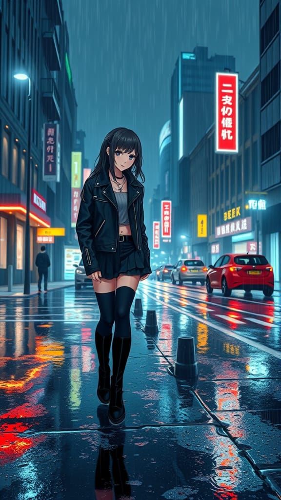 This vibrant anime image captures a goth girl walking alone in a rainy street at night, surrounded by neon city lights and dynamic rain effects, blending moody atmospheres with stylized colors