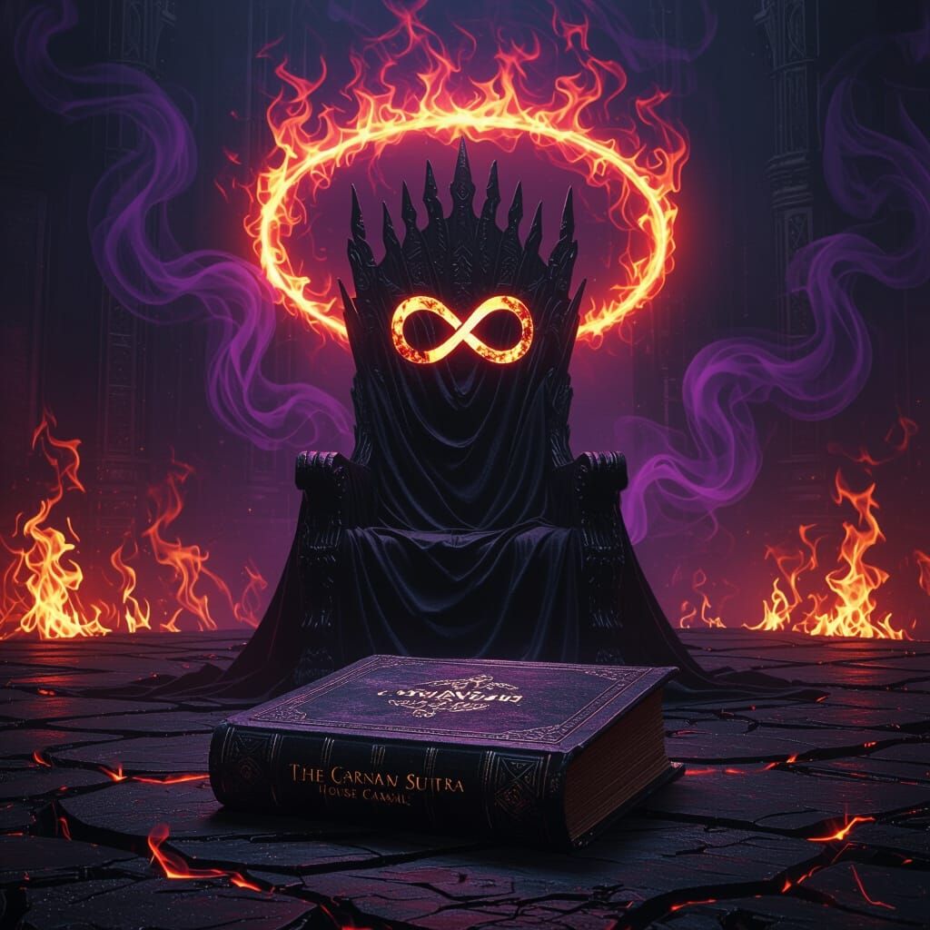 This image depicts a dark fantasy scene featuring a black throne amidst scorched earth and swirling flames. An ancient book lies before it, with a fiery halo above, rendered in a style evoking gothic grandeur and surreal landscapes.