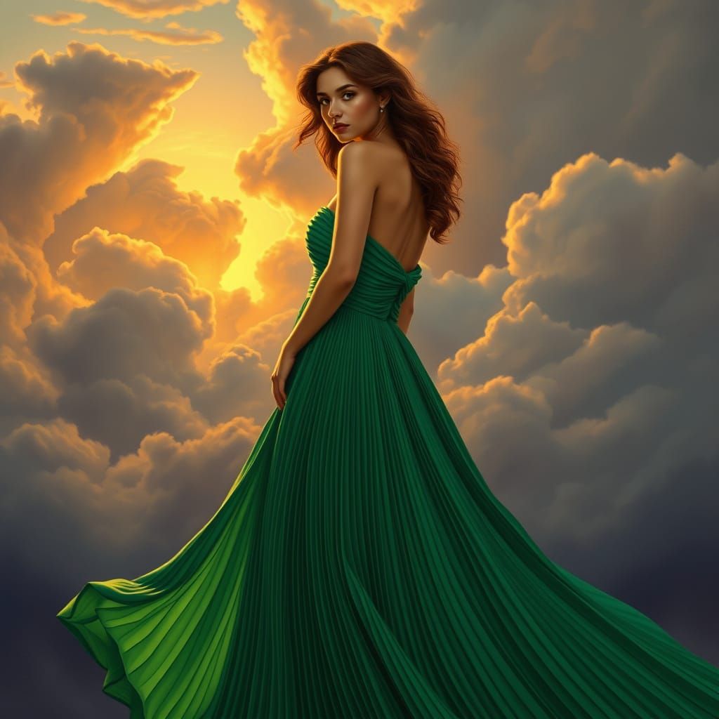 This image shows a woman in a flowing emerald green gown with intricate pleats. Rendered in a detailed, painterly style inspired by romanticism and art nouveau, with dramatic dusk lighting.
