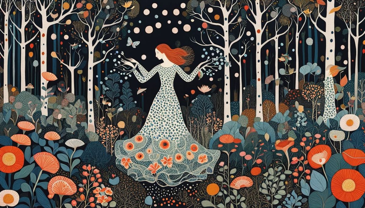 This image shows a surreal, whimsical bio art sculpture of a blooming goddess emerging from a dark forest floor, surrounded by intricate patterns and designs evoking the styles of Gustave Klimt and Yayoi Kusama.