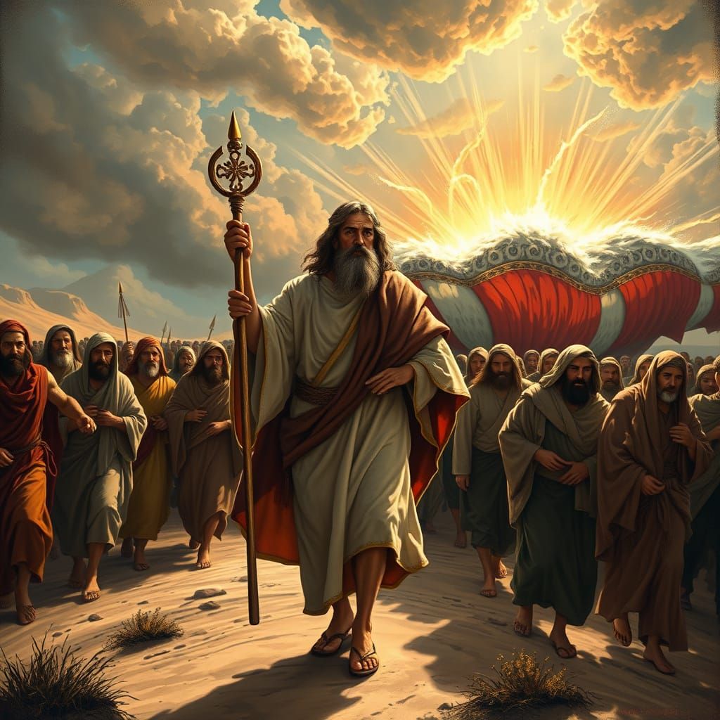 This image depicts Moses leading the Israelites through the desert, with the parted Red Sea in the background, in a dramatic display of divine intervention, inspired by classical realism and Baroque lighting.
