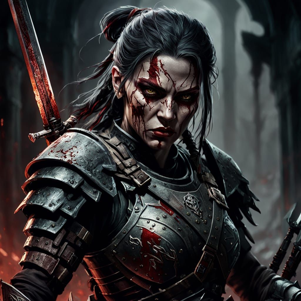 This image shows a battle-hardened warrior woman, her armor stained with blood, clutching weapons in a dark fantasy setting. Ominous shadows and low-key lighting enhance the sinister atmosphere in a cinematic style.