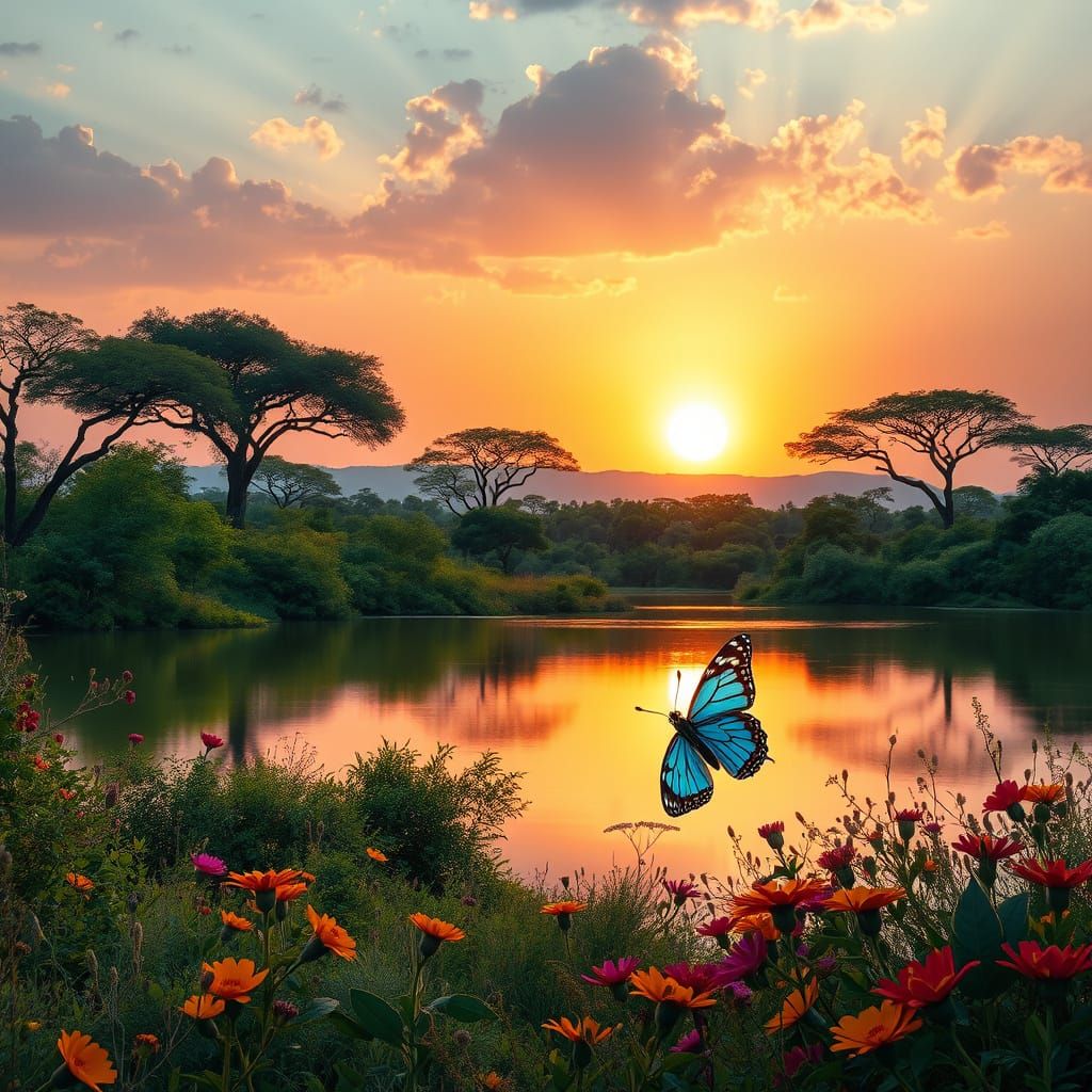 This image shows a serene savannah landscape at sunset, with the sun's warm rays casting a gentle glow on acacia trees, a calm lake, and lush green forests, surrounded by vibrant wildflowers and a delicate butterfly, in a timeless atmosphere of peace and wonder.