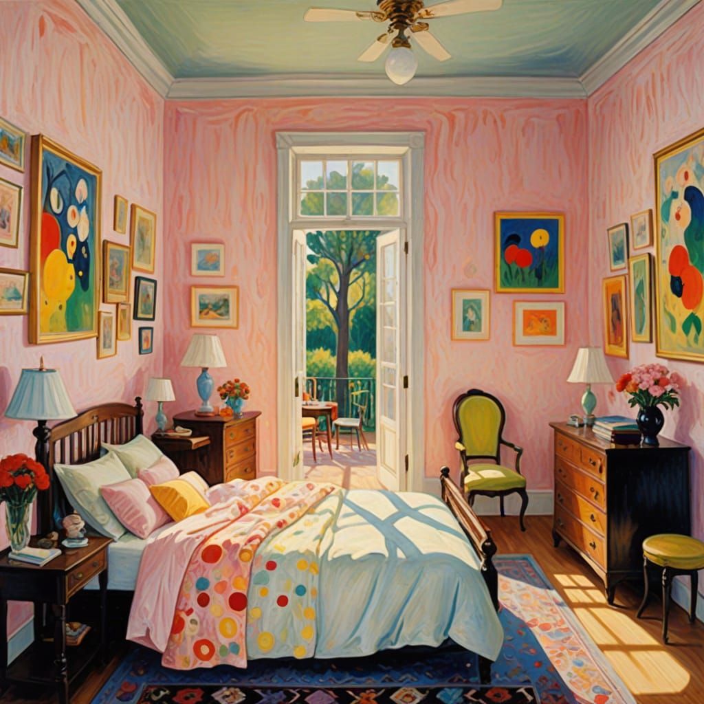 This image features a hyperdetailed 3D rendering of a bedroom with a whimsical Candyland theme. It showcases candy-inspired decor, fanciful furniture, and french doors opening to a private garden.