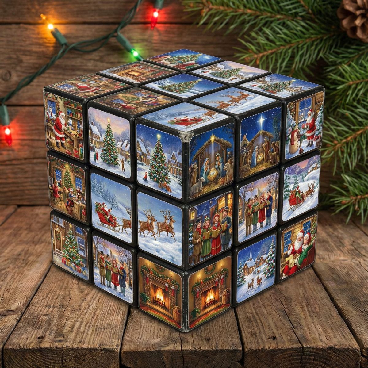 A detailed Rubik's cube where each square displays a unique Christmas scene, perfect for holiday-themed content.