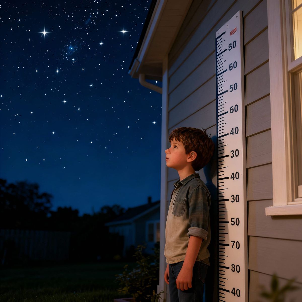 This image shows Sam standing next to a height chart positioned outside against a house wall under a starry night sky. The focus is on the chart.