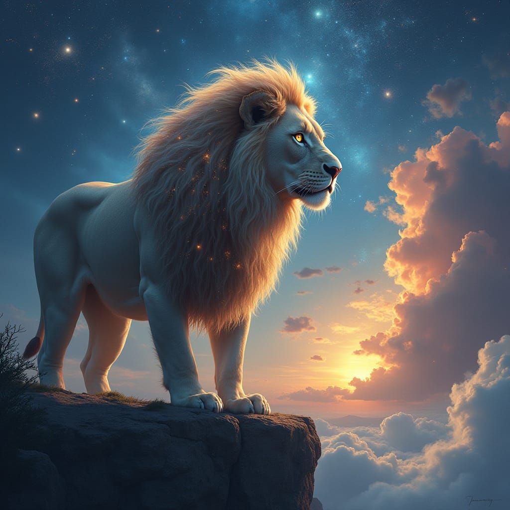 This image shows a majestic lion with a glowing mane, standing on a cliff overlooking a stunning nebula. The atmosphere is filled with a shimmering, otherworldly essence, with distant galaxies and celestial bodies casting an ethereal light. The lion's eyes burn with ancient wisdom and power, blending art...