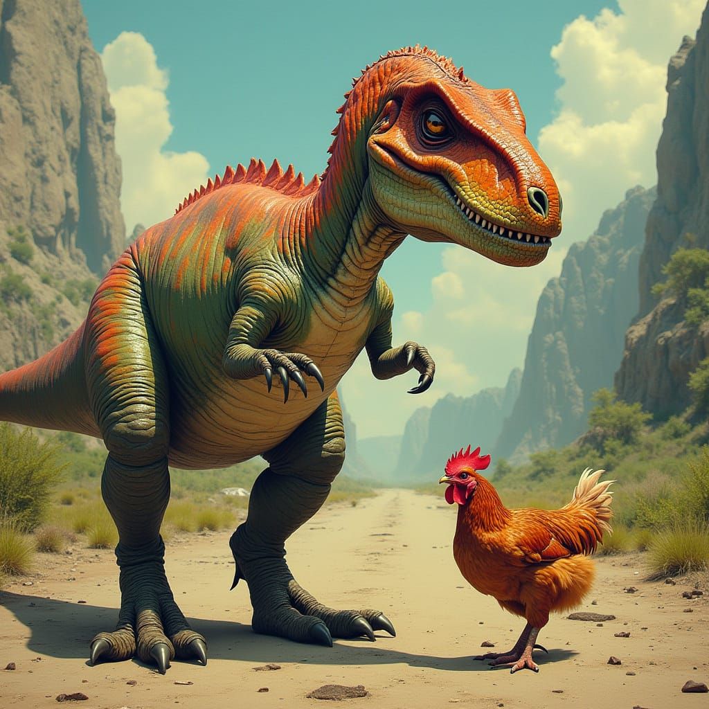 This hyper-detailed image shows a photorealistic T-Rex looking down at a chicken in confusion, rendered with bold colors in a pulp comic aesthetic.