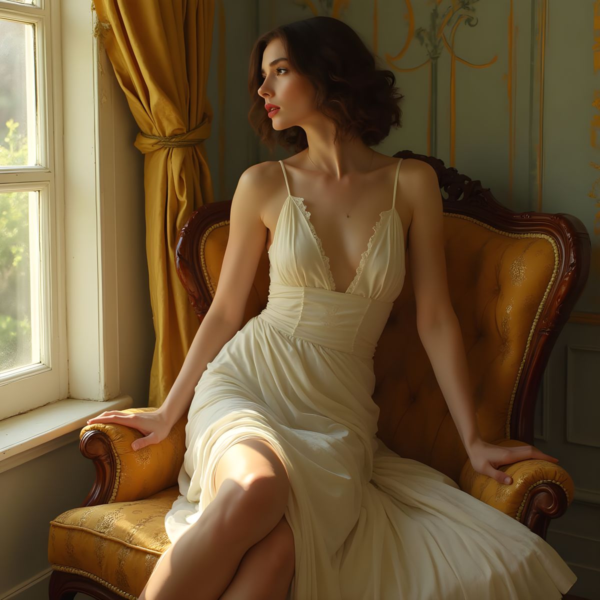 This image shows a striking portrait of a Hollywood actress with exceptionally long legs, captured in a glamorous and elegant pose, showcasing the beauty of a fashion model's physique.