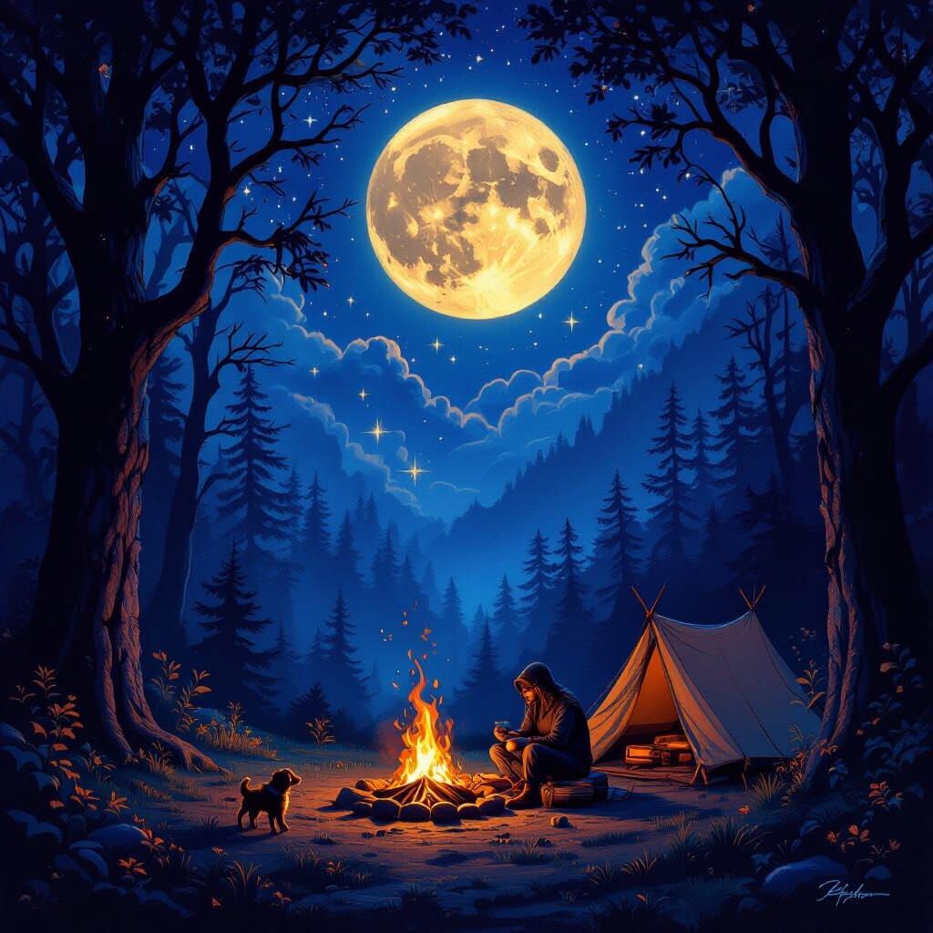 This image captures a magical night scene featuring a mystical forest, luminous moon, and starry sky. A bonfire illuminates a lone figure preparing food, with a tent and dog nearby, rendered in a fantasy art style with dramatic lighting.