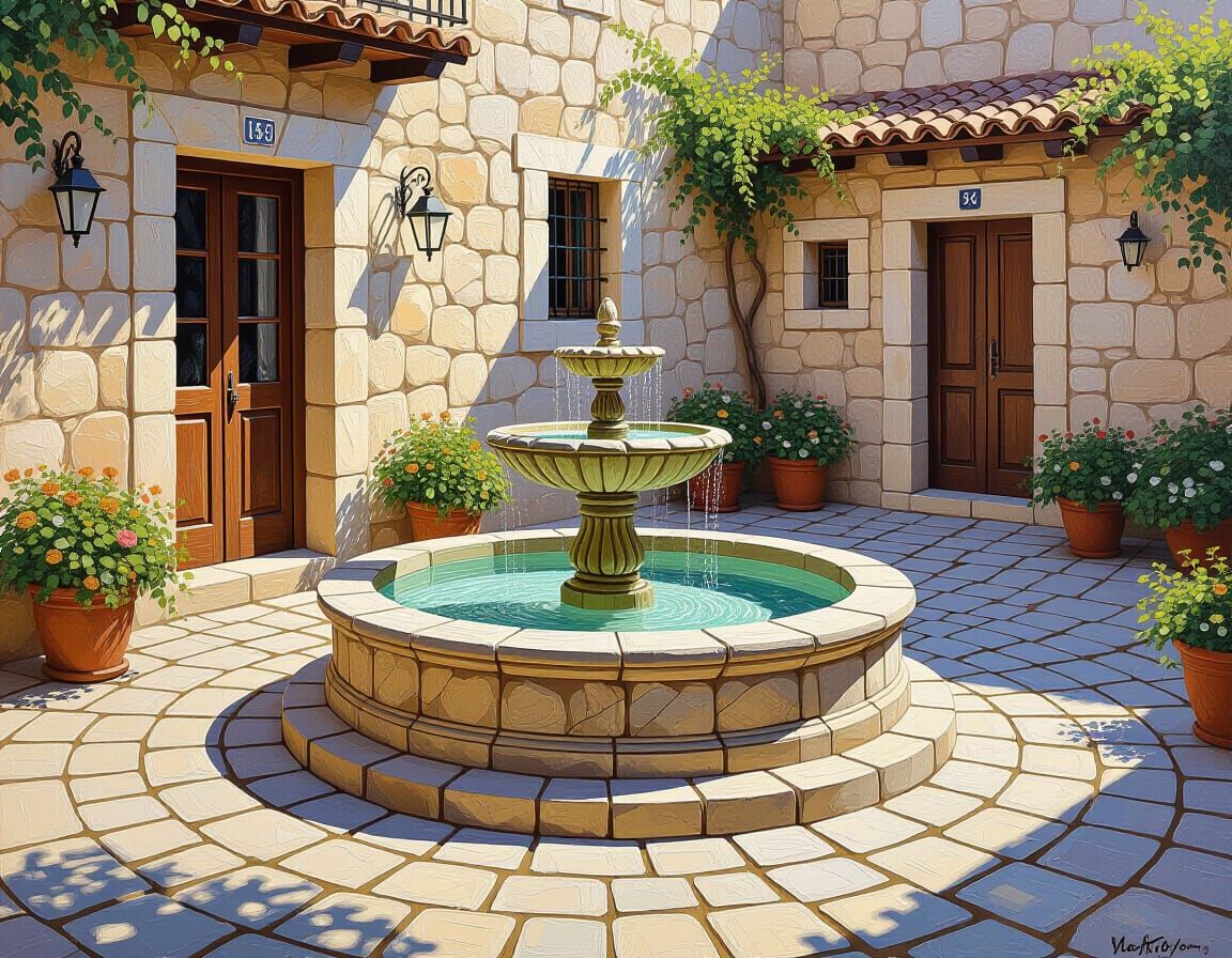 (masterpiece, ultra-detailed, impasto painting, thick brushstrokes, expressive texture, 8K, cinematic lighting, oil on canvas) A Mediterranean courtyard scene painted in the impasto style, every stone and surface brought to life with heavy textured brushwork. At the center: a stone fountain, its circular ...