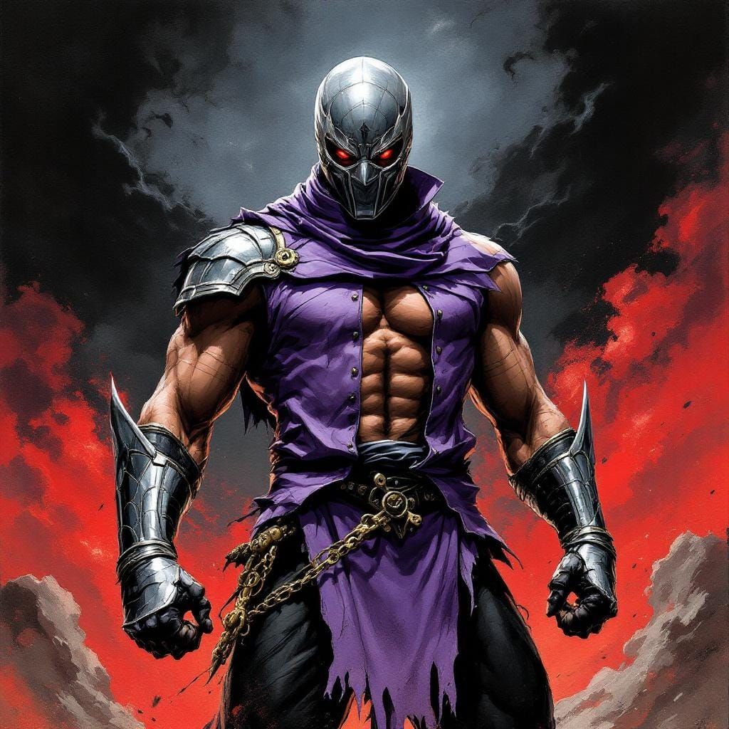 A dramatic ink painting of a male fighter in menacing armor. The figure stands against an erratic sky with red clouds, created with intense brushstrokes and vibrant colors.