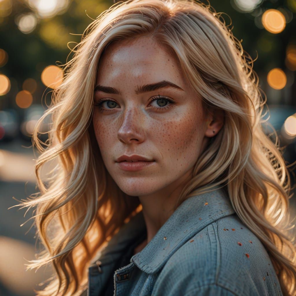 A close-up portrait of a blonde-haired girl with freckles, captured in soft focus. Gentle bokeh, warm skin tones and subtle shadows enhance the Pixar-style, vibrant aesthetic under golden hour lighting.