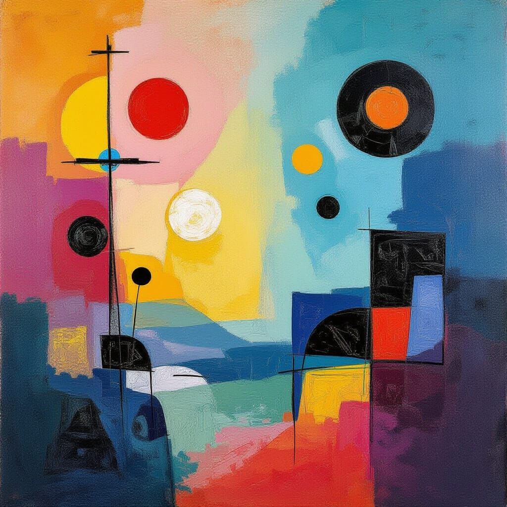 This image shows an ethereal scene with vibrant colors and abstract shapes. The artwork evokes surrealist styles, with bold textures reminiscent of abstract expressionism.