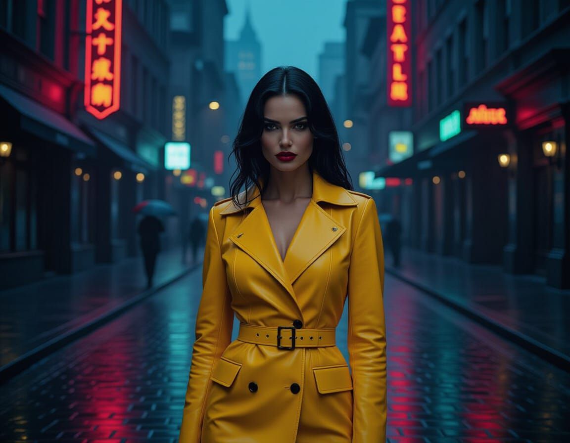 A hyper-realistic close-up of a beautiful vampirewoman in yellow leather on wet cobblestone streets. Neon lights reflect in the rain, creating a dramatic film noir atmosphere.