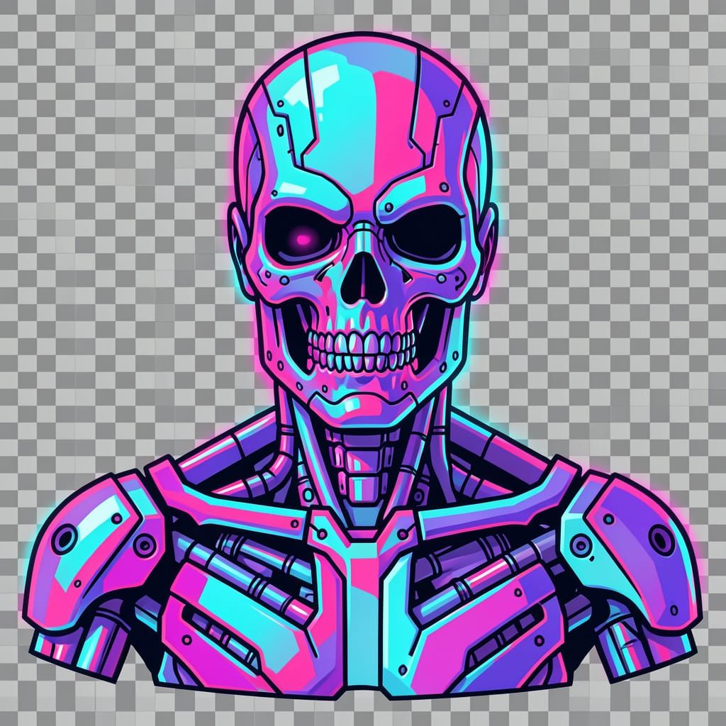 A centered, symmetrical illustration of a powerful cyborg's head and torso. Features sharp lines, neon colors, and glowing highlights in a clean vector artwork style.