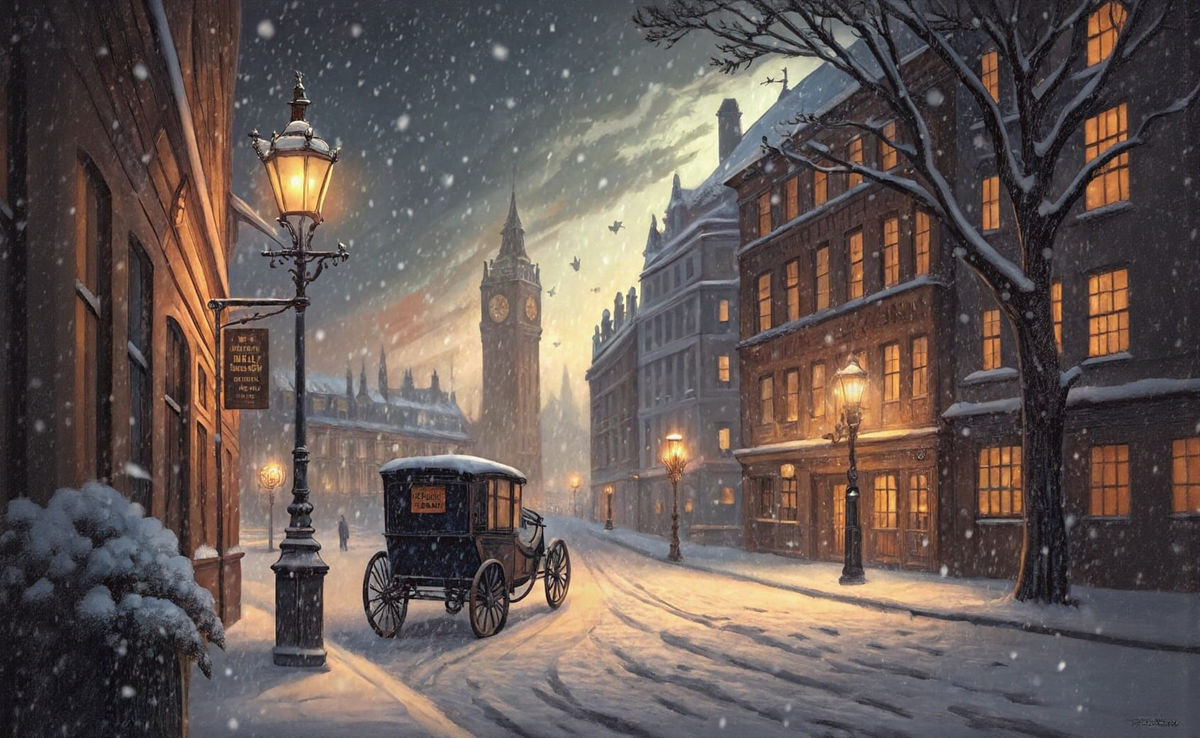A snowy 19th-century London street scene with Victorian buildings. A horse-drawn carriage travels along the road, illuminated by street lamps and reflecting the warm lights on the icy pavement, in an impressionistic style.