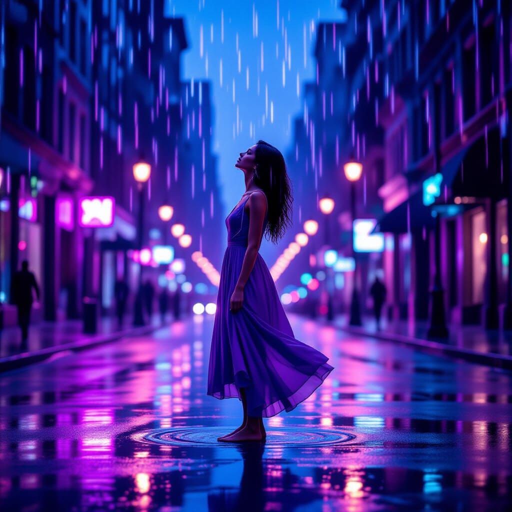 A lone woman in a flowing violet dress, standing barefoot in the middle of a quiet city street. Her face lifted toward the sky as a heavy rain pours down around her. Neon reflections shimmer in the wet pavement. The city glows in deep purples and blues, Digital art, cinematic realism, soft ambient lighting with glowing rain effects, lens flare, and bokeh.