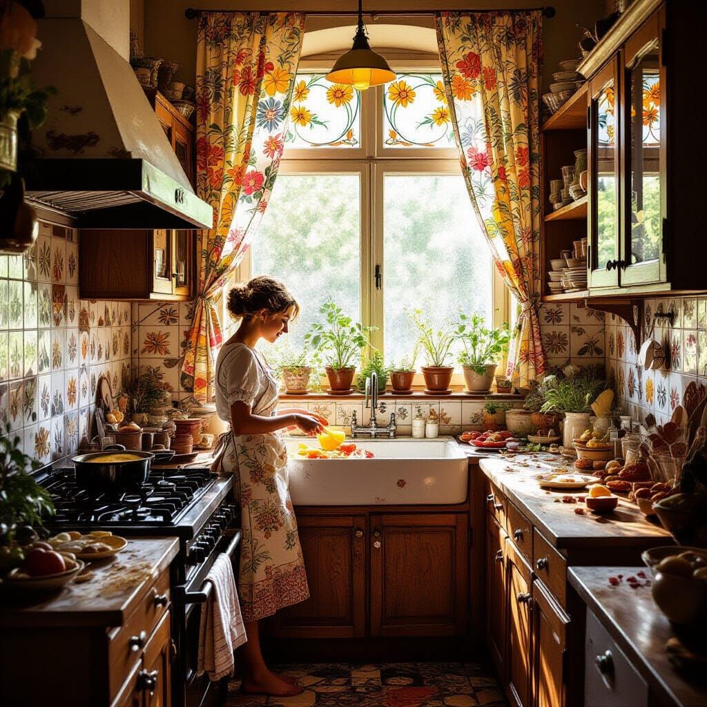 Art Nouveau Poem My Crazy Kitchen My kitchen's a zoo, a chaotic ballet Where spoons do the tango and dishes hold sway The fridge is a canvas of magnets and art A testament to a home that's bursting with heart❤️ So come on in, don't mind the debris In my crazy kitchen, you're family to me. Yeah, you're family to me https://www.udio.com/songs/kckrWmKPzio75HiEDPu21b ↗️ Sanja Zivkovic