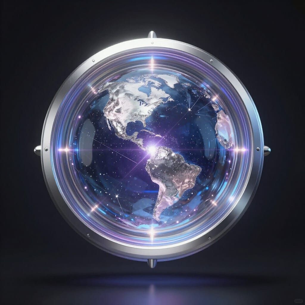 This image depicts a shimmering, abstract universe rendered in a distinct artistic style with a focus on silver tones and intricate details.