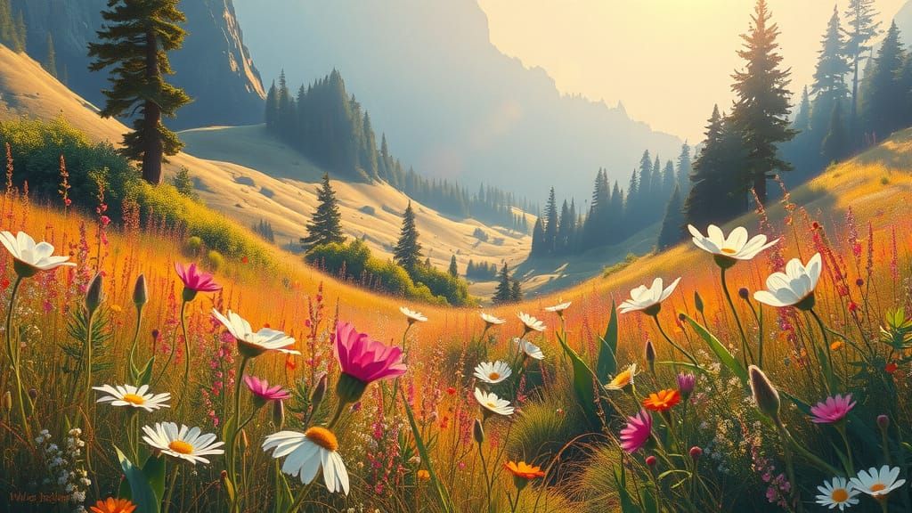 A vibrant astral valley scene filled with wildflowers and soft shadows. The image blends rich oil painting textures with delicate watercolor translucency, reminiscent of art nouveau.