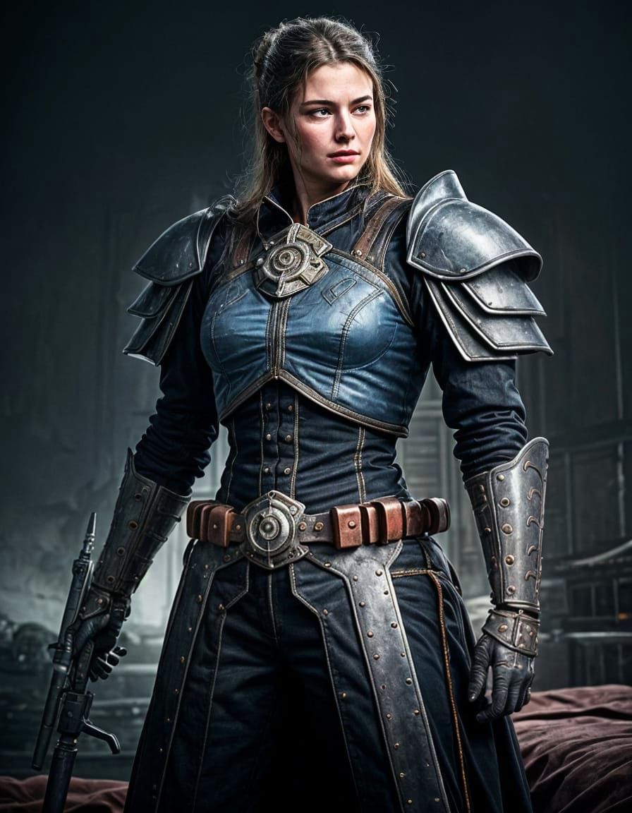 This image depicts a dynamic scene featuring a mechanical engineering truck and a woman in a striking cowboy pose, set against a backdrop with elements of swords and tools.