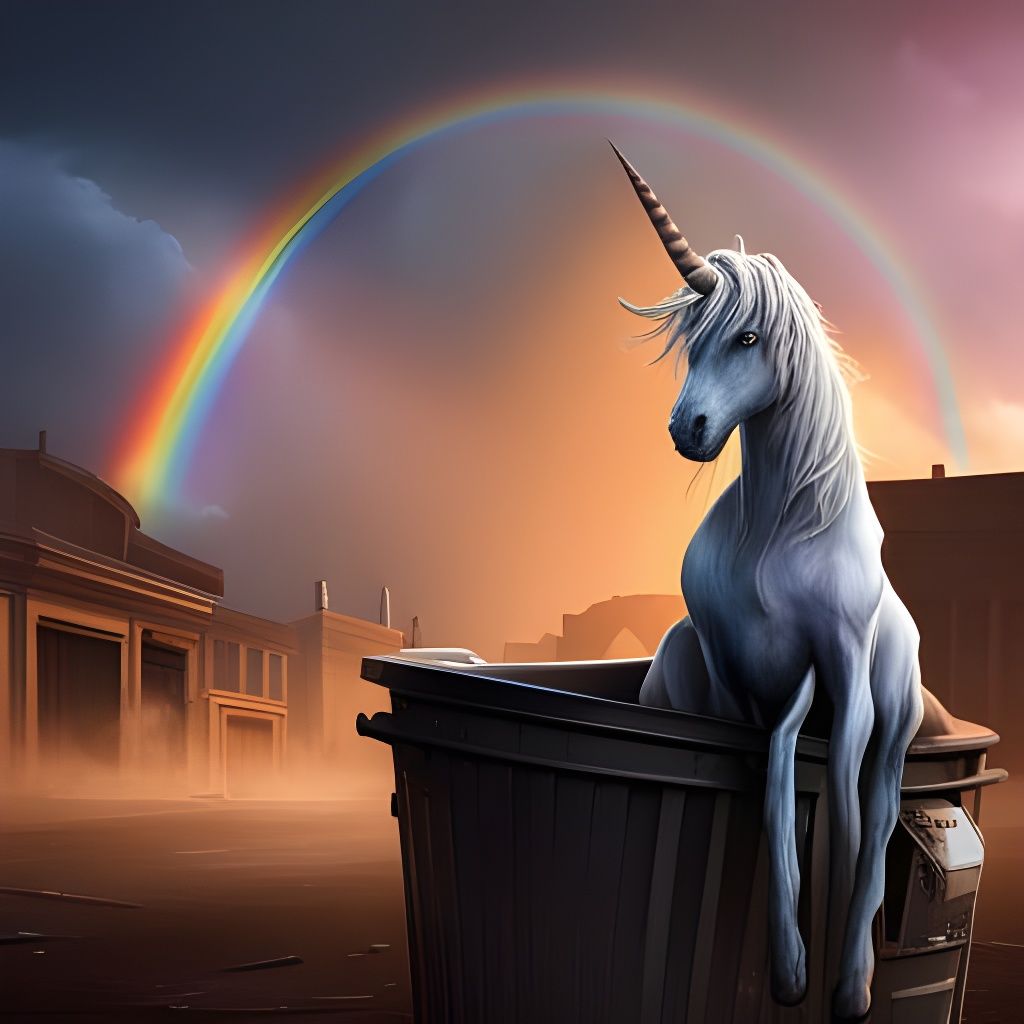 This image shows a dead unicorn rising from a trashcan in a grimy city street. A rainbow appears in the background of this fantastical matte painting with intricate details and deep colors.