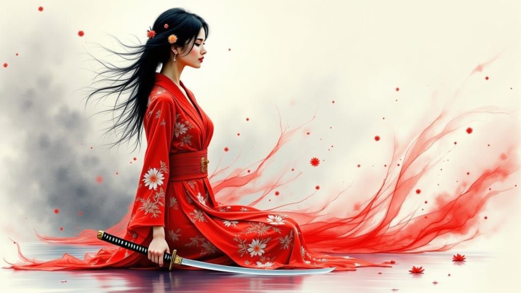 This image depicts a young woman in a flowing red kimono, examining a katana on a dreamlike, watercolor backdrop with soft gradients of muted grays and deep reds.
