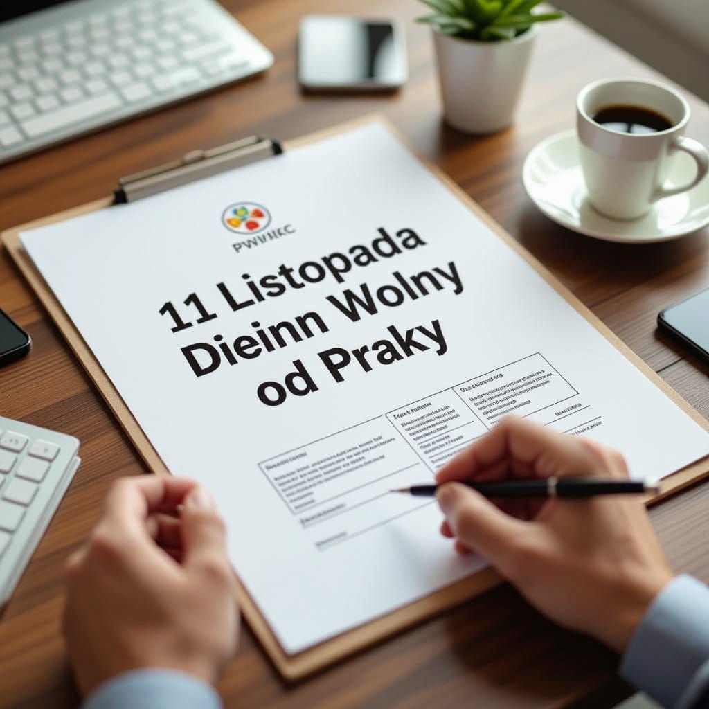 This image is a detailed matte painting celebrating November 11th as a day off, featuring an office desk scene with documents. Rendered with deep, complementary colors in a fantastic concept art style.