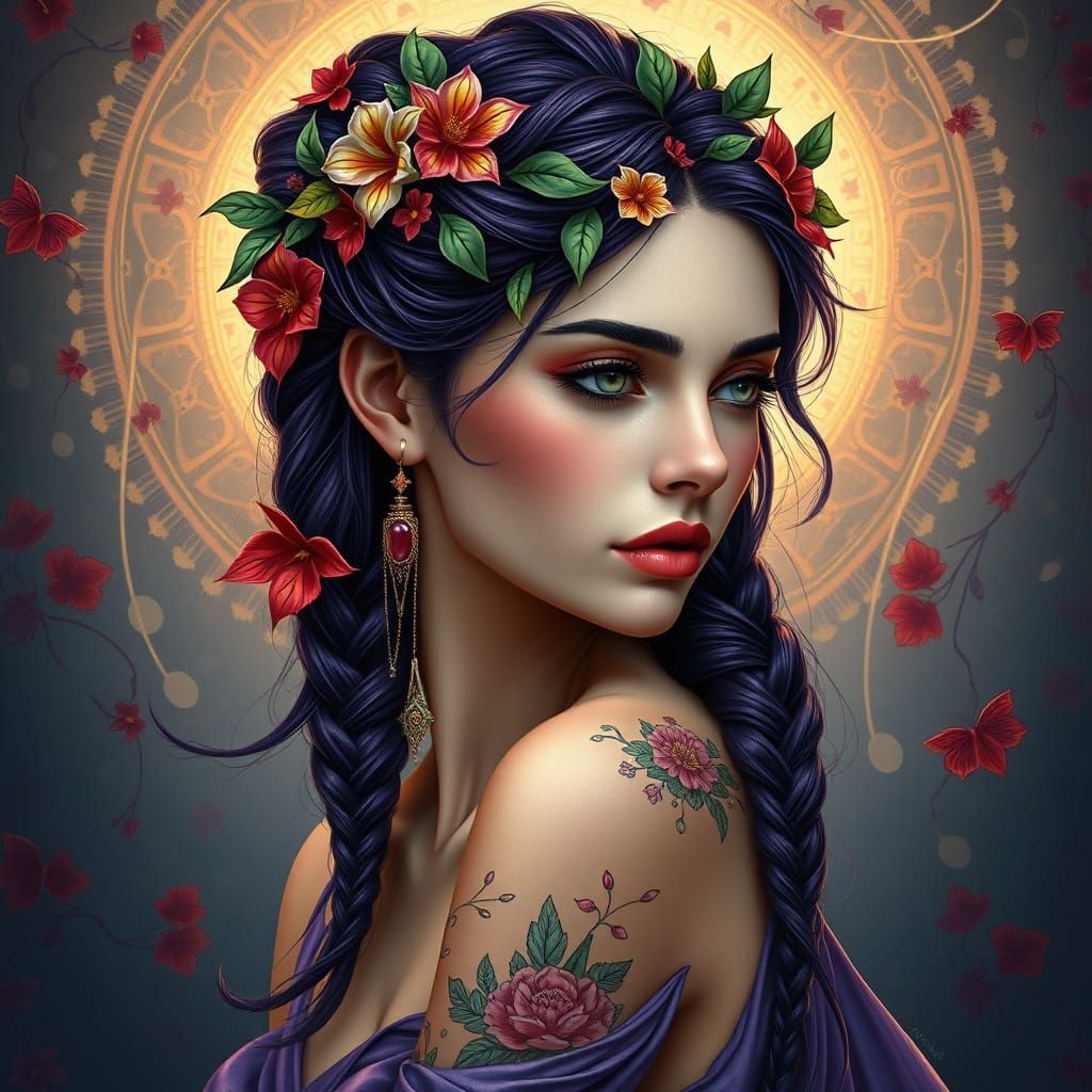 This stunning image features a woman with intricately braided hair adorned with vibrant flowers and leaves, set against a mystical backdrop. Her elegant face is framed by a flowing violet top, revealing intricate floral tattoos on her arm and shoulder. Rendered in ultra-realistic concept art style, with ...