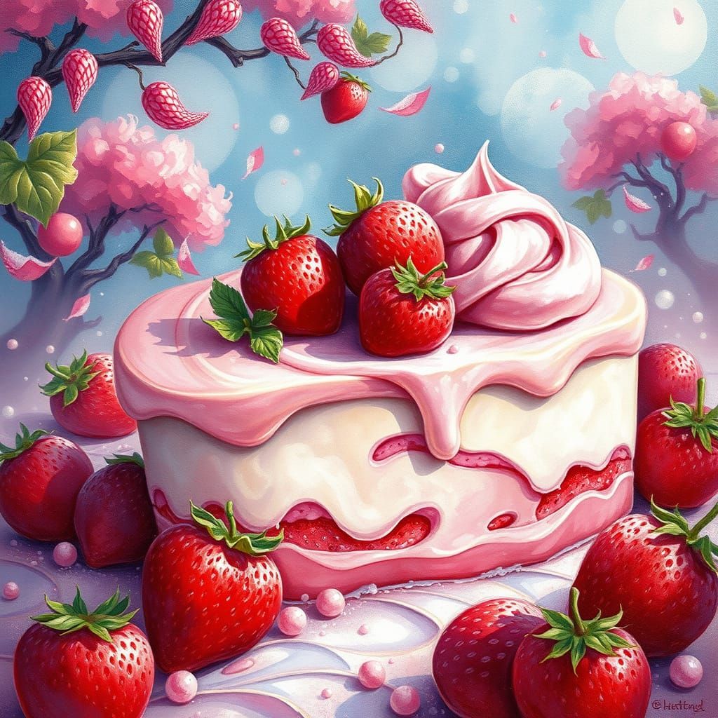 A vibrant ice cream dessert with strawberries and chocolate chips in a fantasy Candyland setting. This digital artwork features swirling colors, ethereal mist, and hyperdetailed textures in an impressionist style.