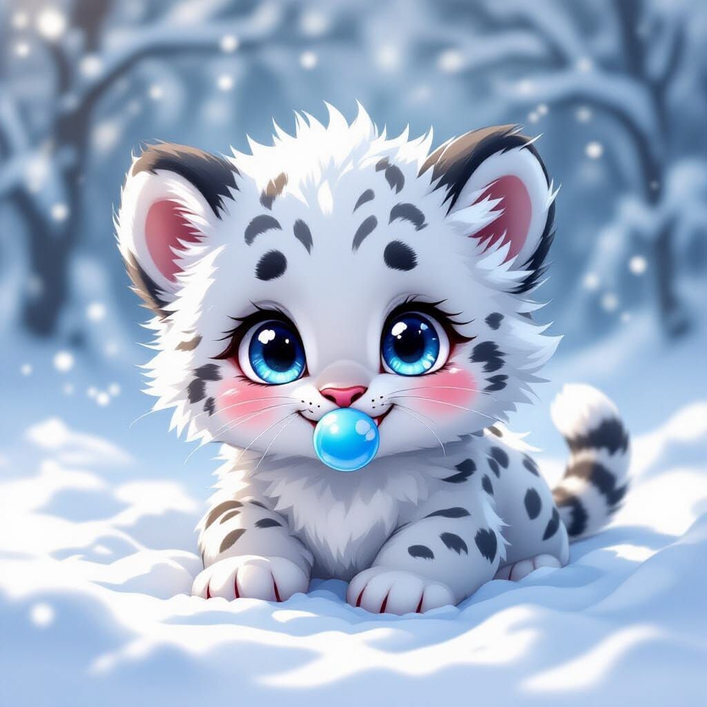 This image features a cute snow leopard cub with large blue eyes, resting playfully in soft snow. The artwork blends hyperrealism with cartoon styles in a serene winter setting.