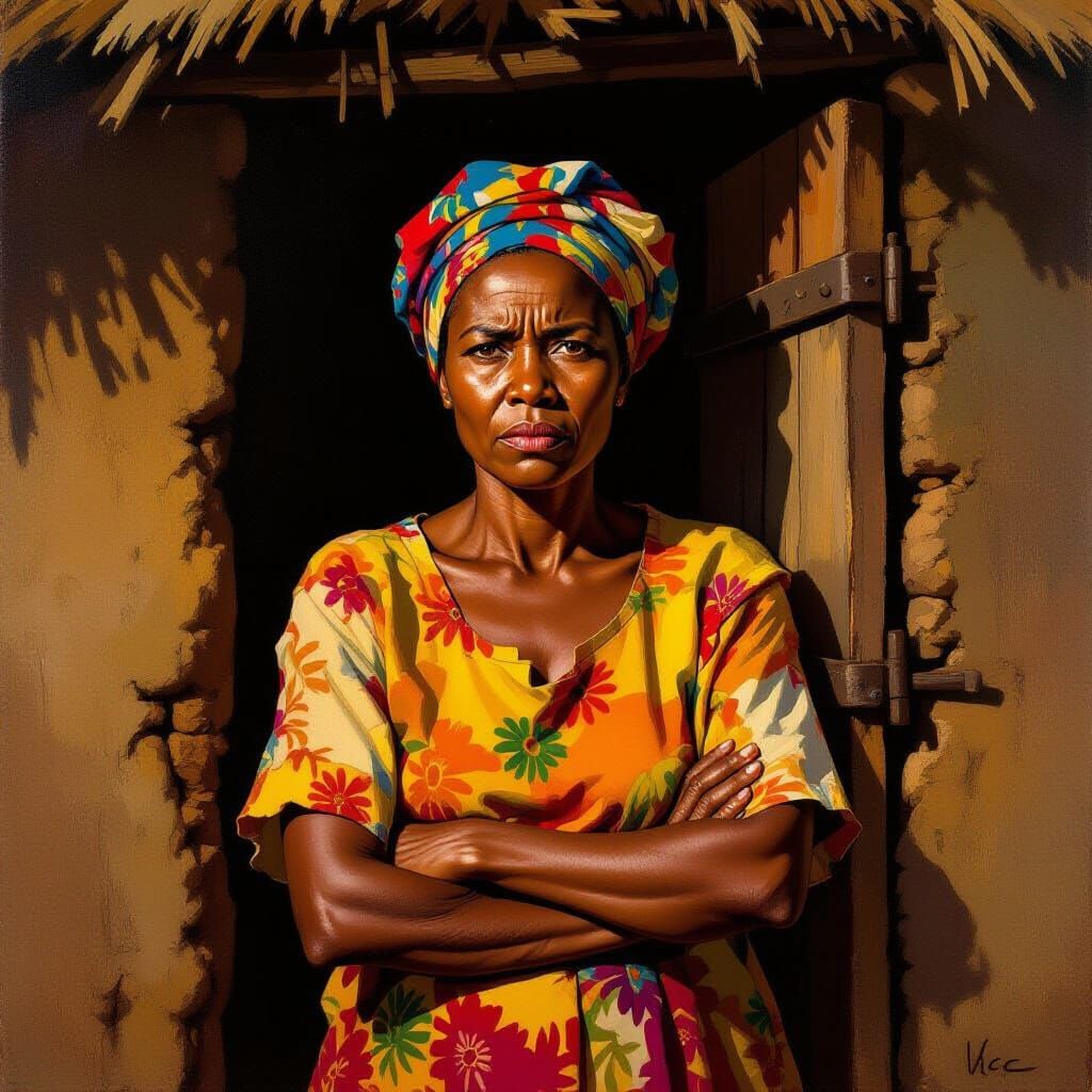This image shows a determined African woman securing a hut door. She stands defiantly before elders, her expression resolute in the dimly lit, earthy interior. The image evokes a painterly style with bold strokes and vibrant colors.