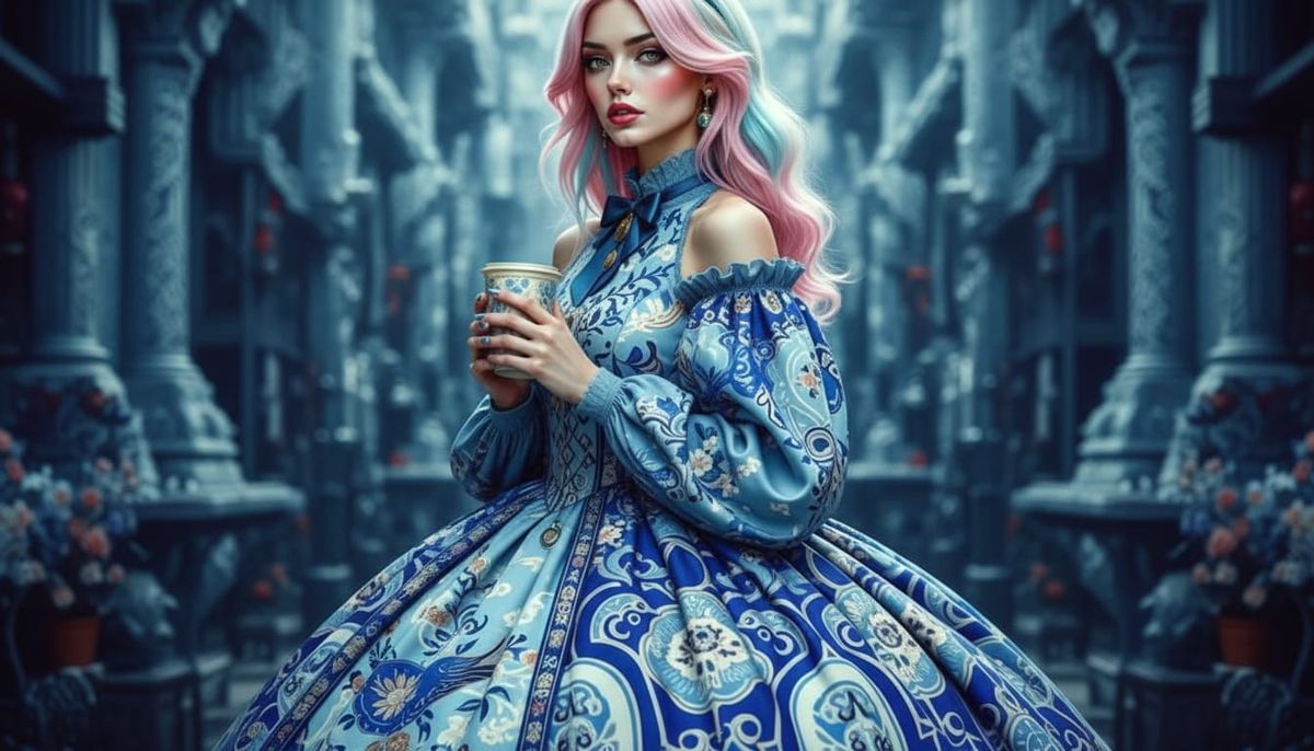 This image features a hyperrealistic, full-body pin-up woman with pink-tipped hair, making direct eye contact. The style blends Utagawa Hiroshige's atmospheric washes, Ingres' precise lines, and Delft pottery's delicate narrative, creating a luminous, refined look.