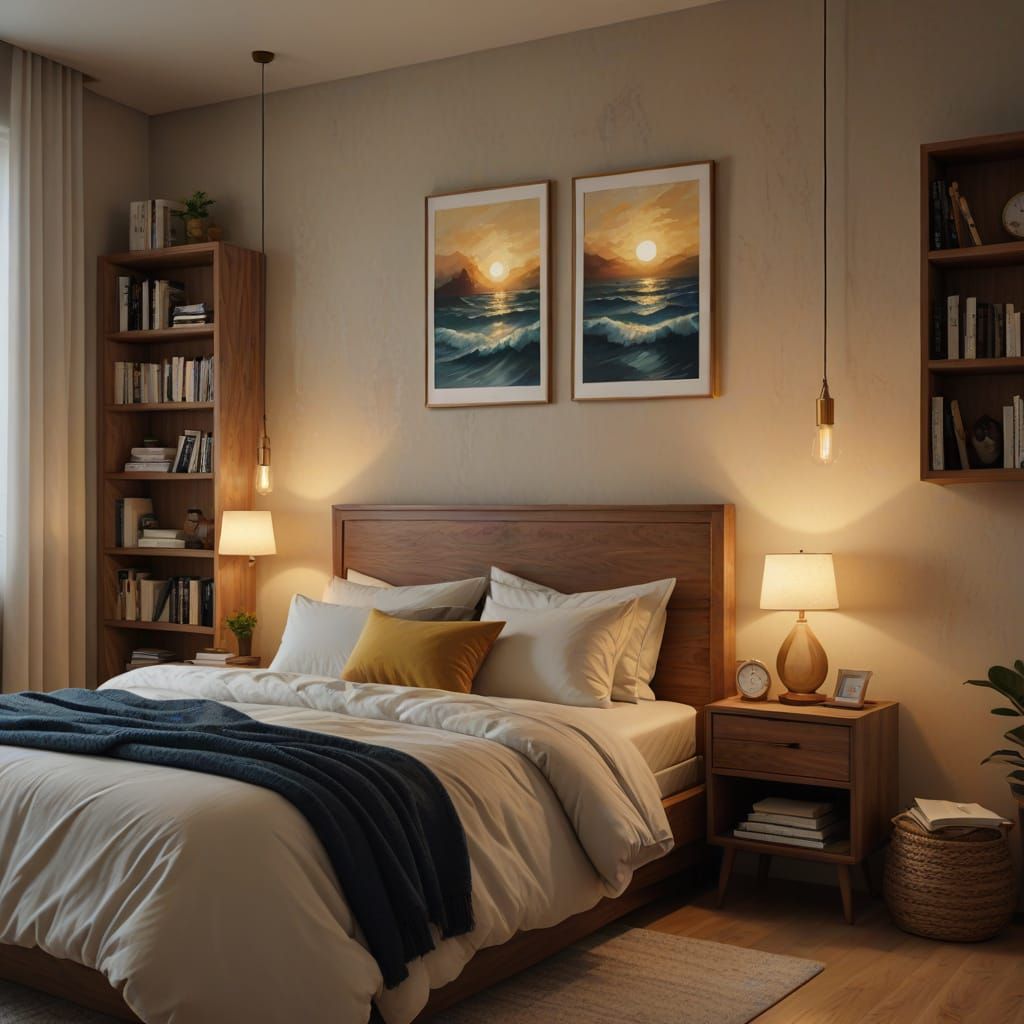 This hyper-realistic digital art shows a cozy bedroom with wooden furniture. Soft brushstrokes and warm golden lighting create a luxurious, inviting atmosphere.