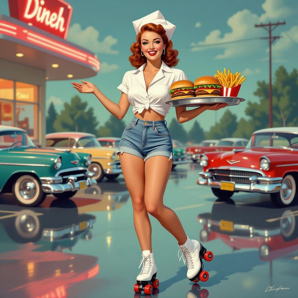 A vibrant 1940s pinup waitress on roller skates, serving burgers and fries at a mid-century diner. Rendered with rich colors and warm, golden hour lighting for a nostalgic feel.