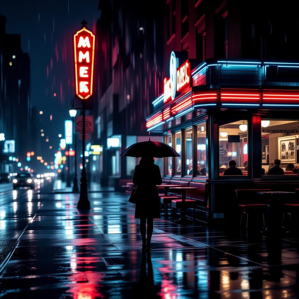 This image shows a rainy city street at night illuminated by a vintage diner's neon lights. A solitary figure with an umbrella is captured in a film noir aesthetic, rendered with soft, muted tones.