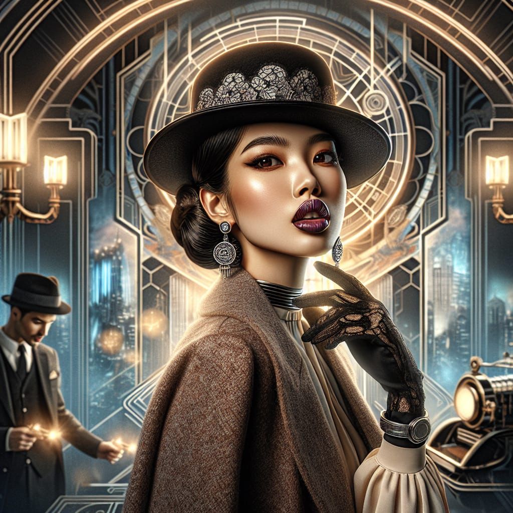 This image shows a stunning pinup girl in a vintage-inspired setting, adorned with a black top hat and Art Nouveau details. With a retro-futuristic twist, she exudes ultra-realism and photo-realism, reminiscent of a digital painting with watercolor effects.