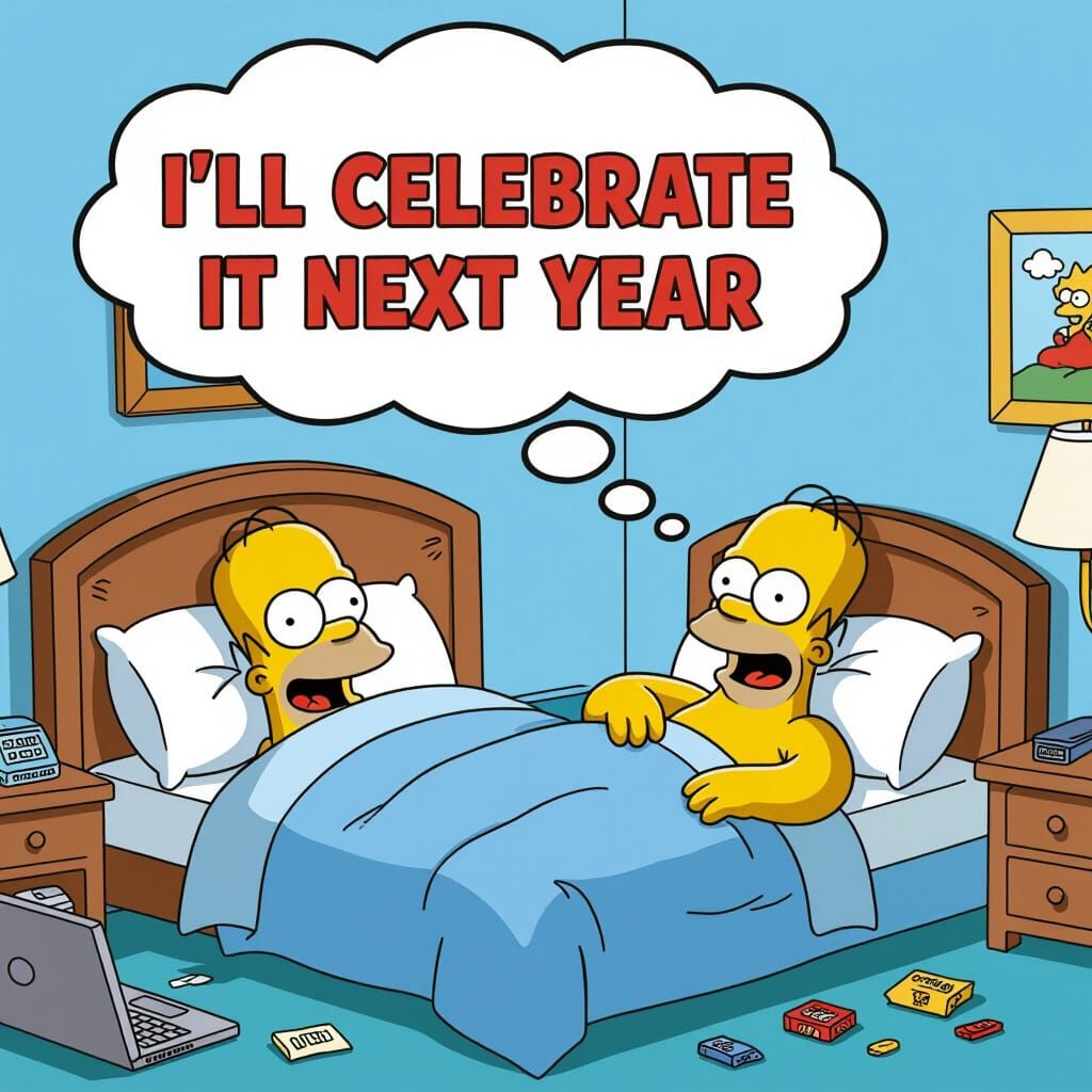A humorous cartoon depicts Homer Simpson lazily in bed, contemplating procrastination. The scene features a relaxed Homer with a thought bubble, rendered in vibrant colors with clean lines.