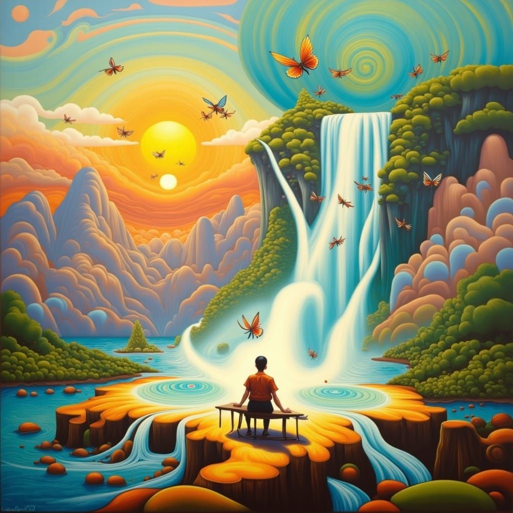This image shows a solitary artist seated at a table transforming into a vibrant, surreal landscape with upward waterfalls and mountain peaks. The scene embodies a sense of calm, intuitive creation in a funky seventies aesthetic.