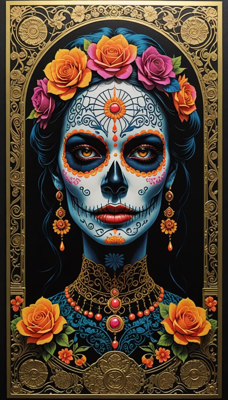 This image is an advertisement for an online banknote auction, featuring a close-up of a beautiful woman in a Day of the Dead style, reminiscent of old banknotes with vibrant neon colors and intricate engravings.