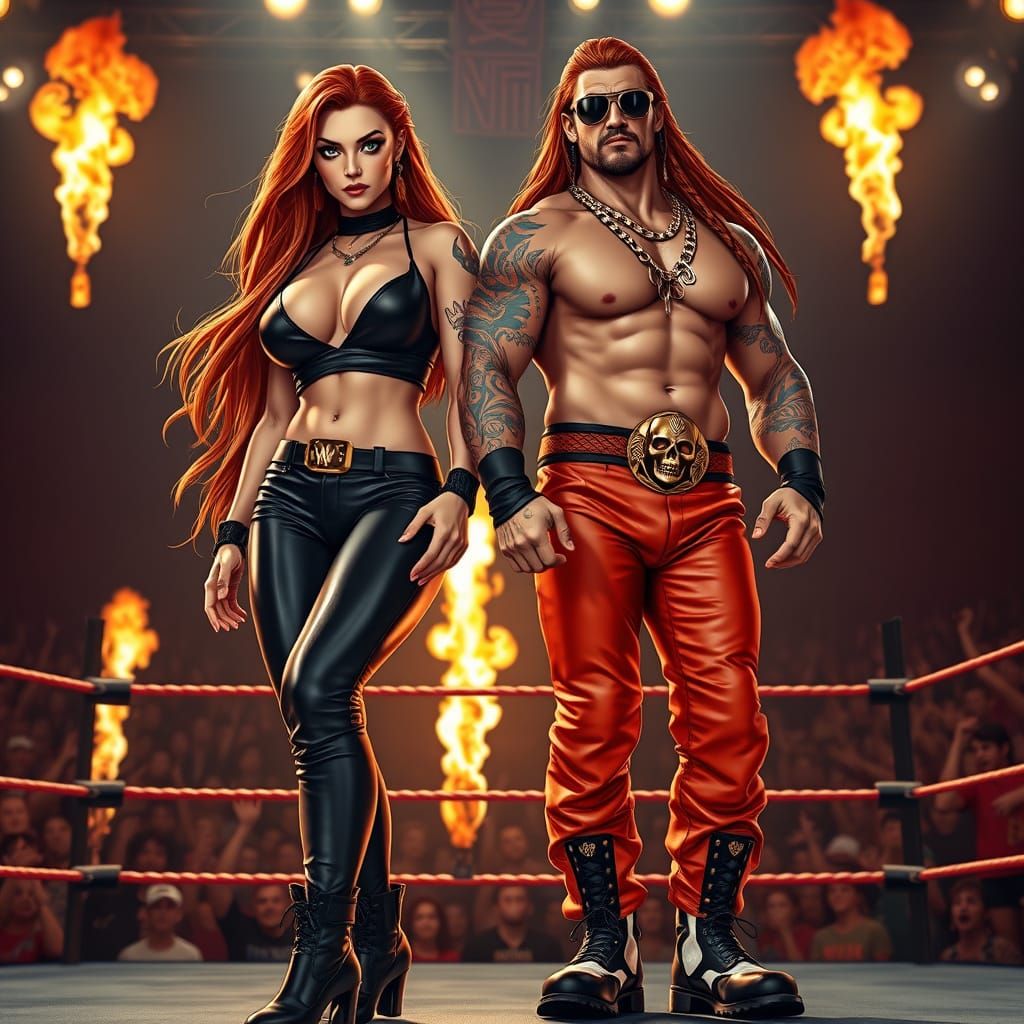 A striking picture of two ginger-haired wrestlers in a fiery arena. The female wrestler sports a black choker and red top, while the male has flame tattoos and sunglasses, all in a gritty 3D anime style.